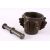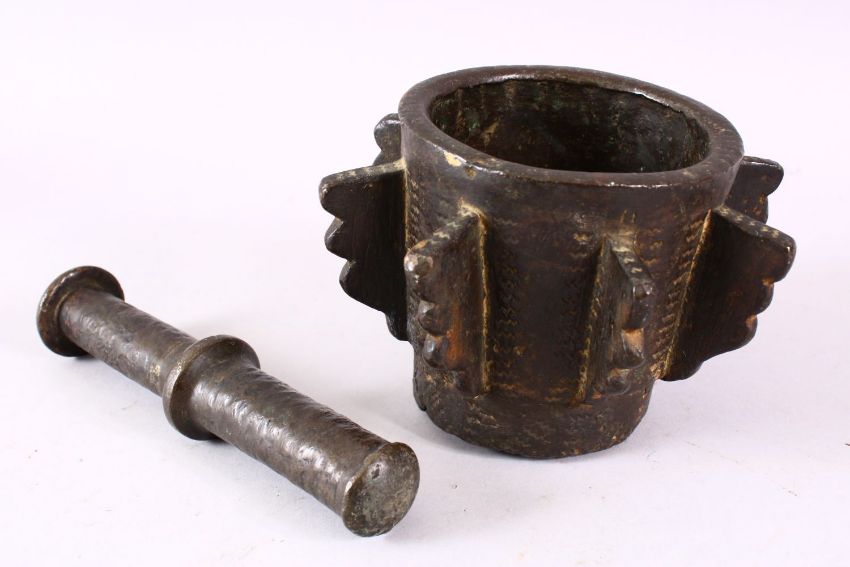 AN EARLY ISLAMIC HISPANO MORESQUE ANDALUSIAN BRONZE PESTLE AND MORTAR, possibly 12th/13th Century, the mortar itself with flanged decoration.