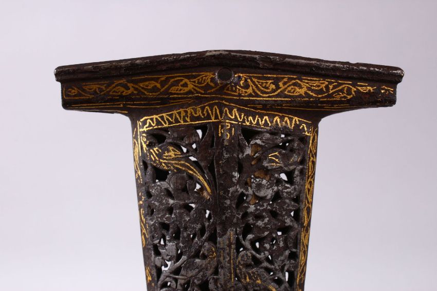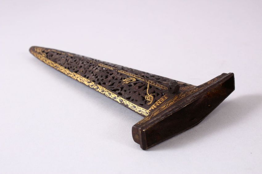 A 19TH CENTURY ISLAMIC GOLD INLAID STEEL OPENWORK DAGGER SHEATH, 21cm.