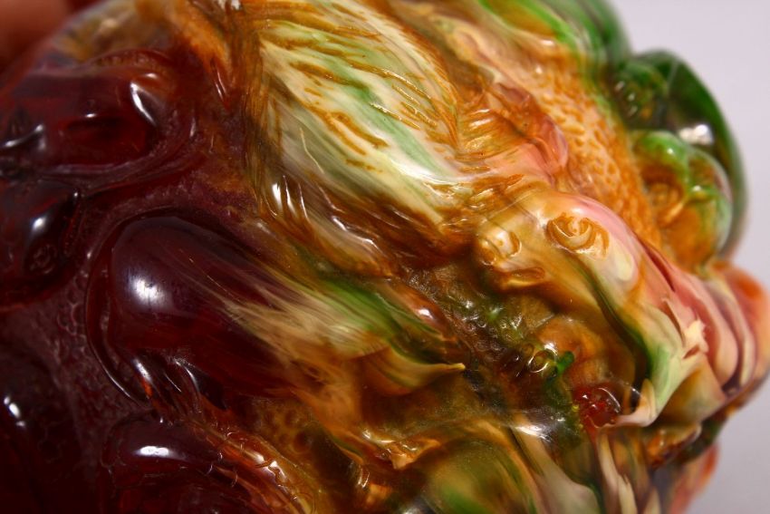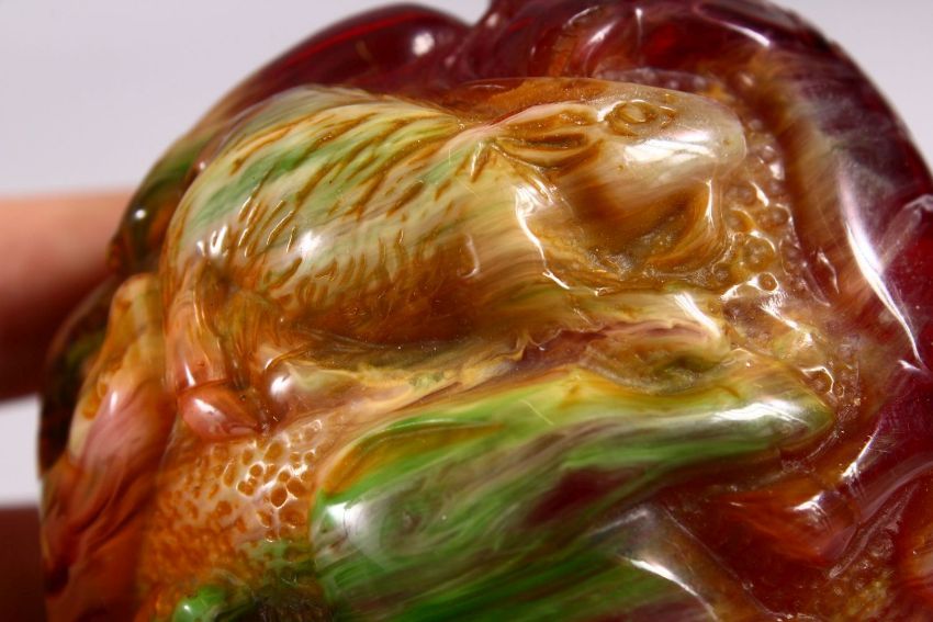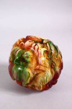 A CHINESE CARVED BAKELITE OR CHERRY AMBER ZODIAC BALL, carved with animals, 9cm diameter.