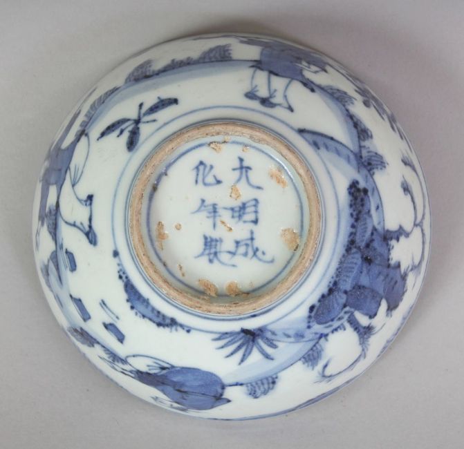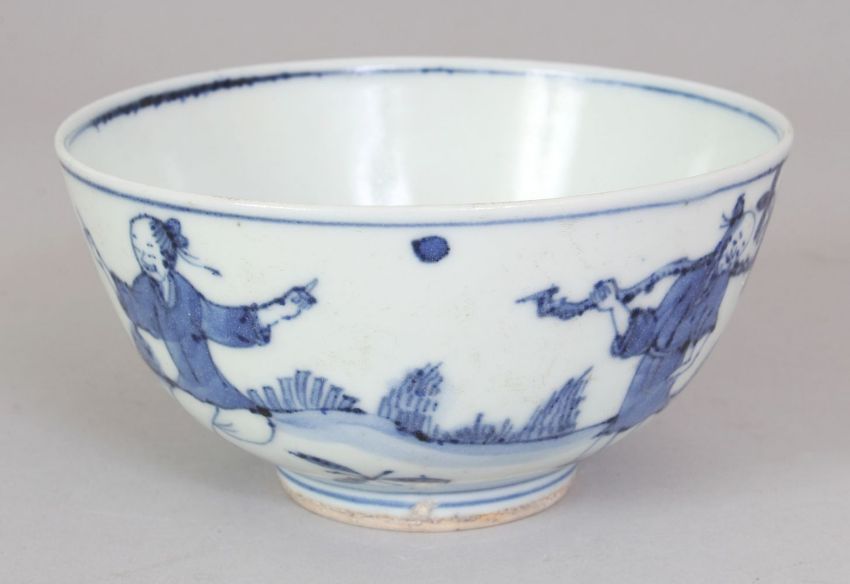 A CHINESE WANLI STYLE BLUE & WHITE PORCELAIN BOWL, the sides decorated with figures in a continuous garden setting, the base with a six-character mark, 12cm diameter & 6cm high.