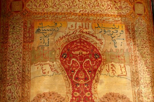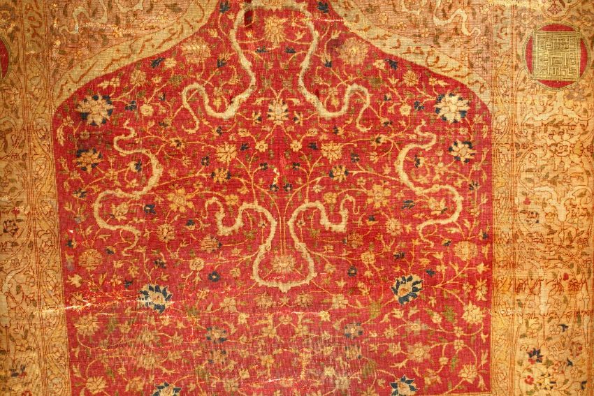 A GOOD 17TH / 18TH CENTURY PERSIAN SAFAVID STYLE PRAYER RUG, with calligraphy and floral scrolling decoration.