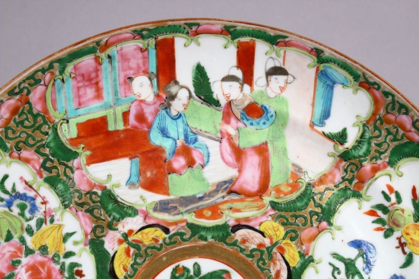 A CHINESE 19TH CENTURY FAMILLE ROSE CANTON PORCELAIN PLATE with panel decoration of figures interior and birds amongst flora, 24cm.