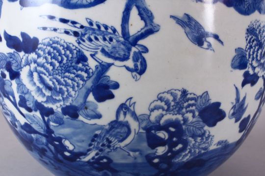 A CHINESE BLUE AND WHITE JARDINIERE, painted with birds amongst native flora, 23cm high, 28cm diameter.