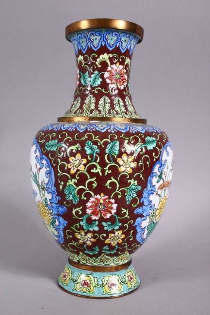 A GOOD 20TH CENTURY CHINESE ENAMEL VASE - ith a cafe au lait ground and panels of birds amongst flora, with lappet borders, 23cm high .