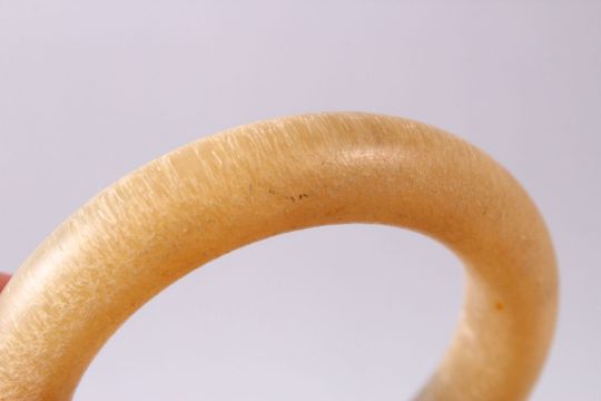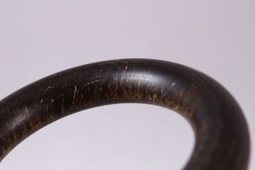 TWO CHINESE HORN STYLE BANGLES, 9cm diameter.
