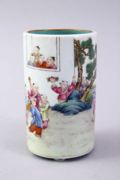 A GOOD CHINESE REPUBLIC STYLE FAMILLE ROSE PORCELAIN BRUSH WASH, decorated with scenes of figures in a landscape celebrating, the base with an iron red mark, 12cm high x 7cm
