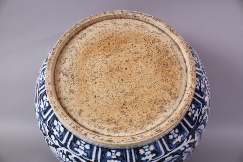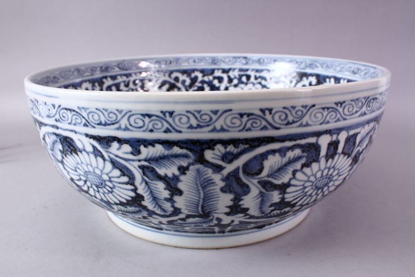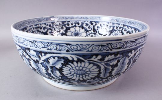 A LARGE & HEAVY CHINESE MING STYLE BLUE & WHITE PORCELAIN BOWL FOR ISLAMIC MARKET, the bowl decorated with native floral display including lotus, 41cm diameter.