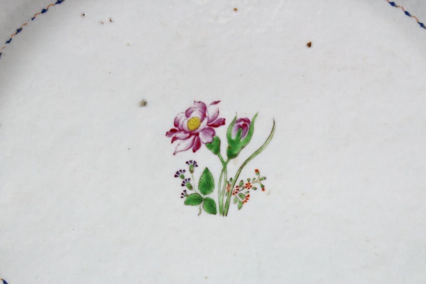 A FINE CHINESE 18TH CENTURY FAMILLE ROSE EXPORT PORCELAIN SERVING DISH, with typical floral borders with a central display of flora, 37cm x 30cm