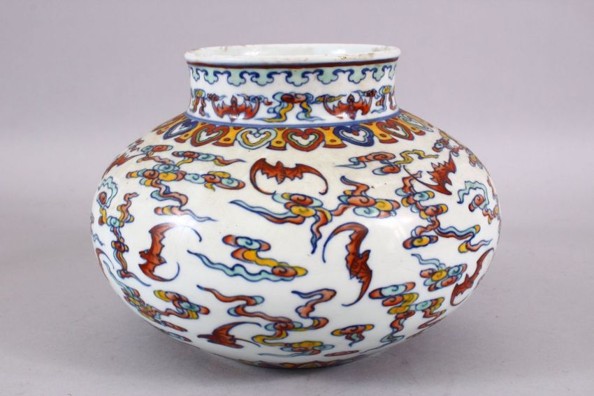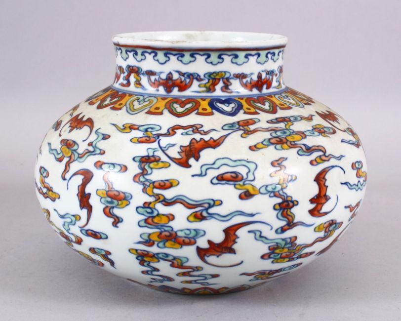 A CHINESE WUCAI DECORATED PORCELAIN JAR - decorated with bats amongst stylized clouds, with ruyi borders, the base with a six character mark, 7cm high x 22cm diameter.