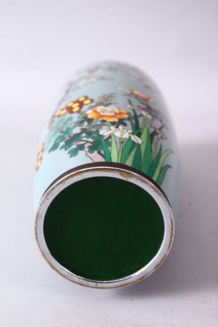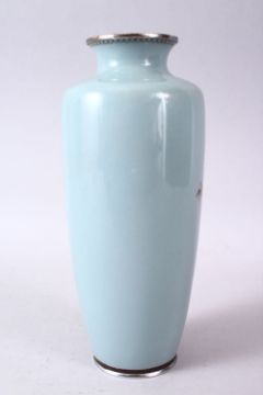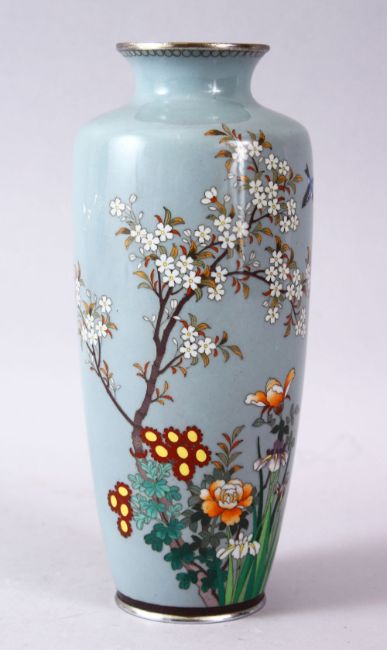 A JAPANESE MEIJI PERIOD POSSIBLY SILVER WIRE CLOISSONE VASE, with scenes of birds, prunus and iris, upon a blue/grey ground, with chromed mounts, 21.5cm.