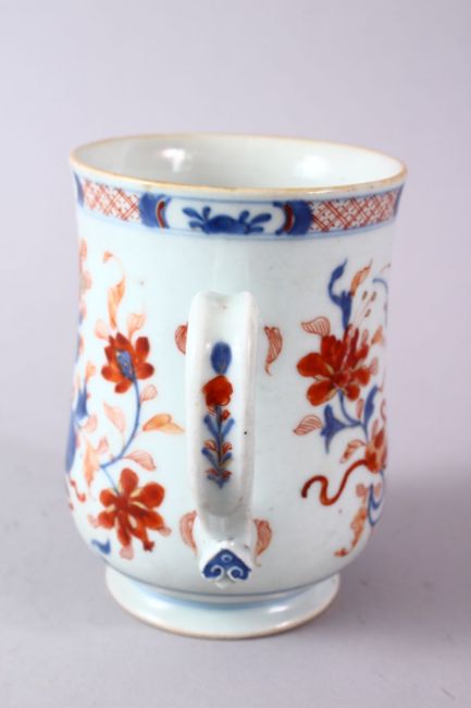 A 18TH/19TH CENTURY CHINESE IMARI PORCELAIN TANKARD, decorated in typical imari palate of flora with a ruyi handle, 14.5cm high.