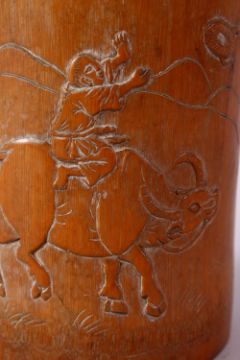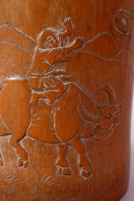 AN 18TH CENTURY CHINESE BAMBOO BRUSH POT, carved with a man riding an oxen with calligraphy, 15cm high.