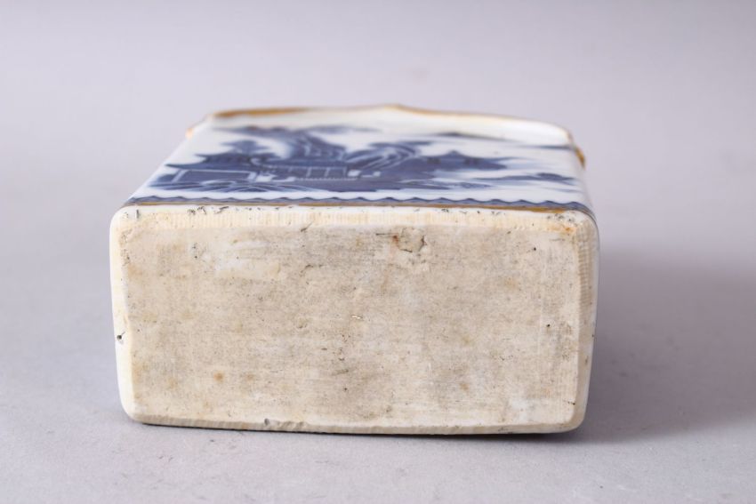A CHINESE 18TH CENTURY QIANLONG BLUE & WHITE PORCELAIN CADDY, with scenes of a landscape with gilt highlights, 11.5cm x 9cm