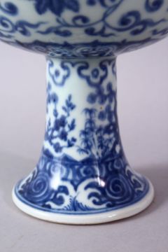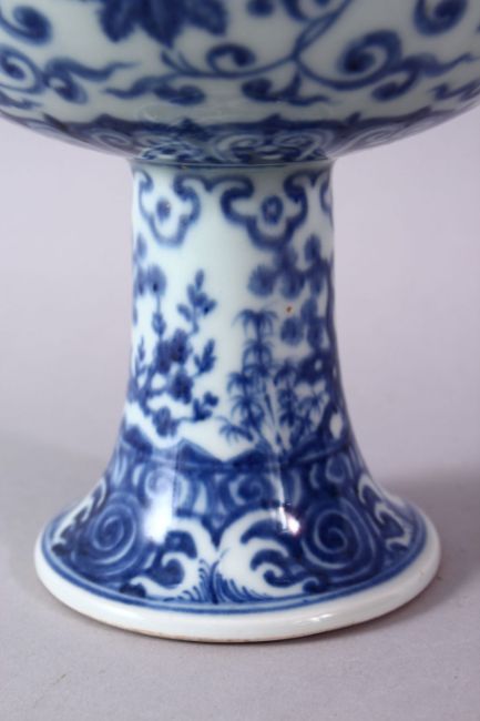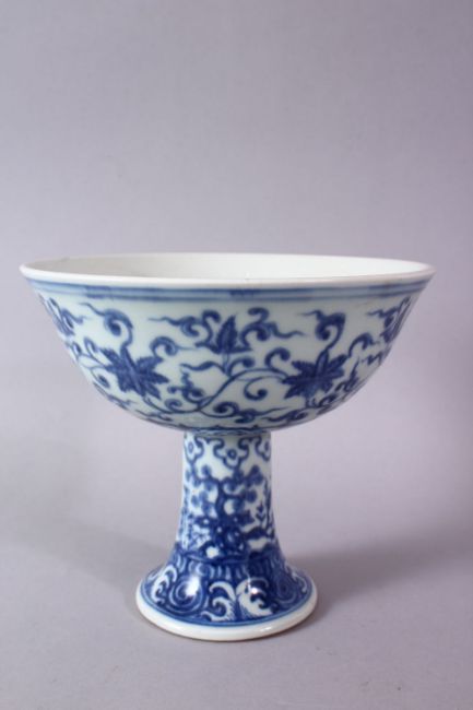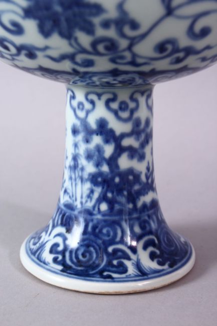 A CHINESE BLUE & WHITE PORCELAIN STEM BOWL - FOR THE ISLAMIC MARKET, decorated with formal scrolling lotus rosette, 16cm high x 18cm diameter