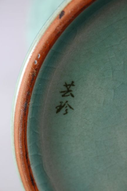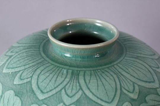A LARGE KOREAN CELEDON VASE, the body with srolling foliage, signed, 38cm high.
