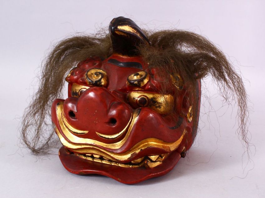 A JAPANESE MEIJI / TAISHO PERIOD LACQUER HANNYA / DEVIL MASK, with real hair detailing, gilt highlights, a moving mouth, 22Ccm high x 19cm wide.