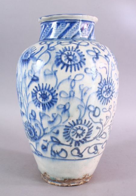 A LARGE 18TH CENTURY PERSIAN SAFAVID BLUE & WHITE GLAZED POTTERY VASE, the vase decorated with stylized flower motif, 33cm high.