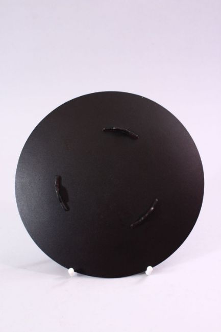 A JAPANESE MEIJI PERIOD DAMASCENE MIXED METAL & IRON PLATE / DISH, the plate with inlaid decoration of a bird amongst native pine tree, stood on three formed feet, with artist engraved mark, 15cm diameter.