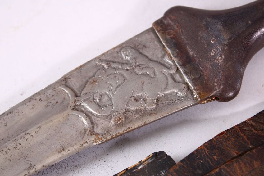 AN 18TH/19TH CENTURY INDIAN JAMBYIA, with steel hilt, the curving blade decorated with hunting scenes, in a leather scabbard, 35cm long.