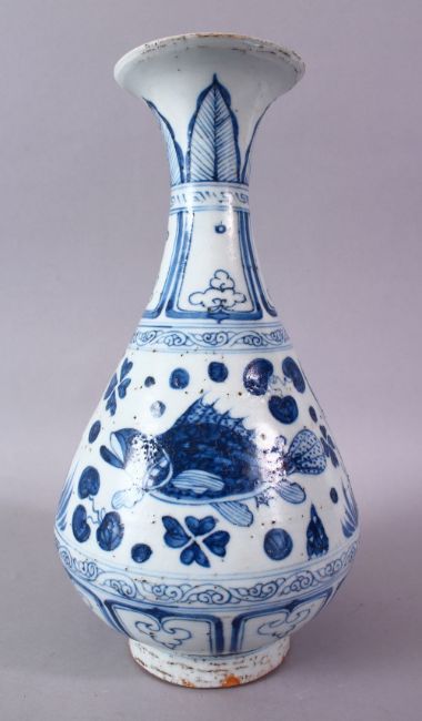 A CHINESE YUAN STYLE BLUE & WHITE PORCELAIN FISH VASE, decorated with two fish swimming amongst reed, 30cm