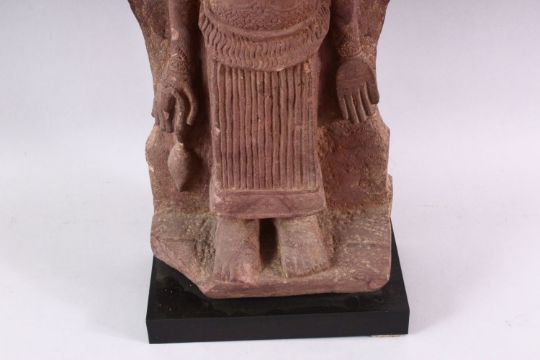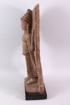 A 12TH CENTURY STYLE CAMBODIAN KHMER STYLE RED SANDSTONE CARVING OF A FOUR ARMED DEITY, 52cms high.