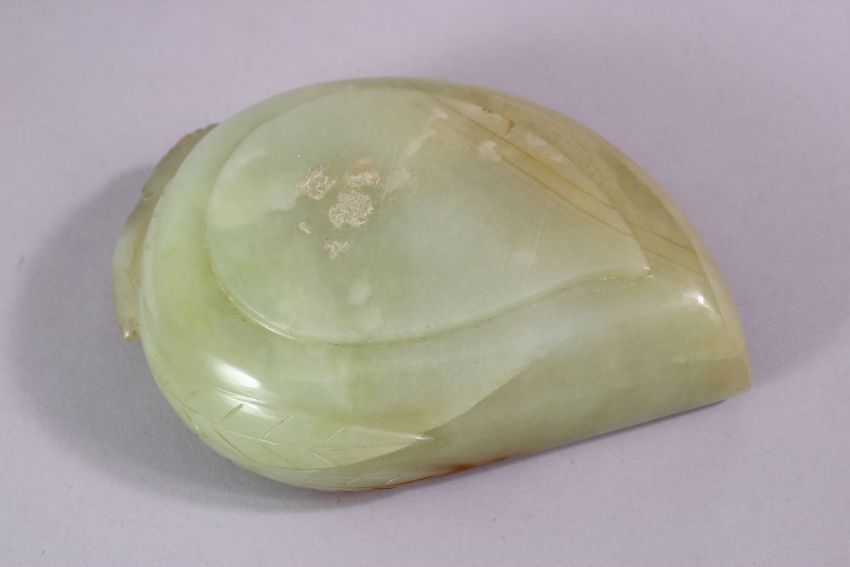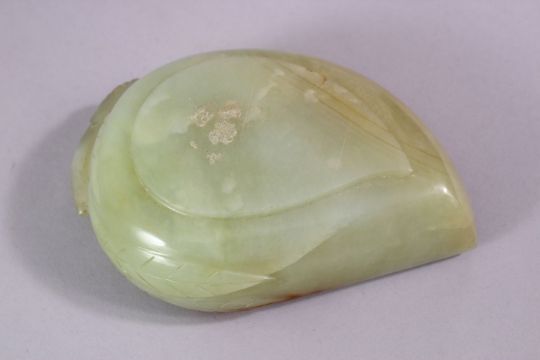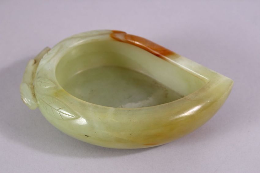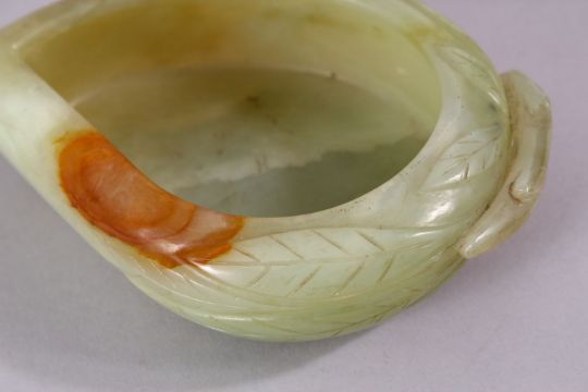 A GOOD 19TH CENTURY JADE LEAF SHAPED BRUSH WASHER, the sides carved with leaves, 13cm x 9cm.