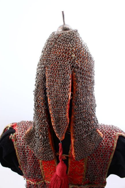 A FINE 19TH CENTURY EXAMPLE OF AN INDIAN LINED CHAIN MAIL SUIT OF ARMOUR, museum quality and housed upon a fitted stand, 86cm high x 62cm wide.