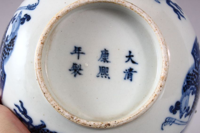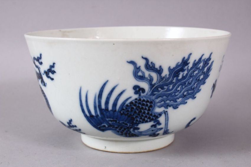 A CHINESE BLUE AND WHITE PORCELAIN BOWL, painted with phoenix and dragons, the base with Kangxi mark, 16cm diameter.