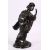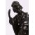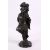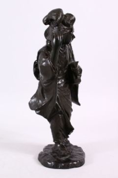 A JAPANESE MEIJI PERIOD BRONZE OKIMONO OF A GEISHA GIRL, stood holding her musical instrument, upon stylized base, the base with an impressed seal mark, 31cm x 20cm