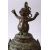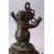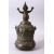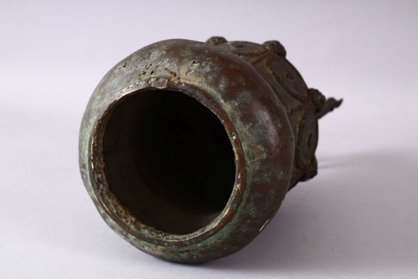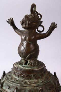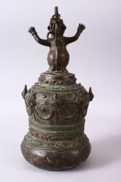 AN EARLY INDONESIAN BRONZE TEMPLE BELL, the top with a mythical beast finial and hanging chain, the body with hanging motif in relief, 33cm high, 15cm diameter.