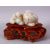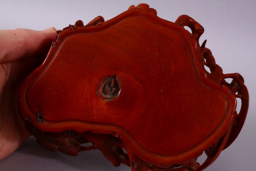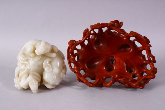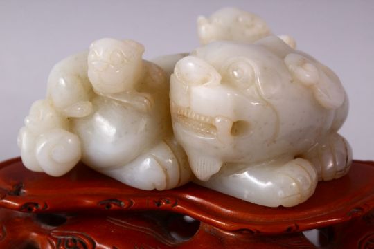 A GOOD CHINESE CARVED WHITE JADE FIGURE OF THREE LION & BOXWOOD STAND, one larger dog with two young climbing upon, with its carved boxwood floral stand, the figure: 13cm x 4.5cm high, overall height 11cm.