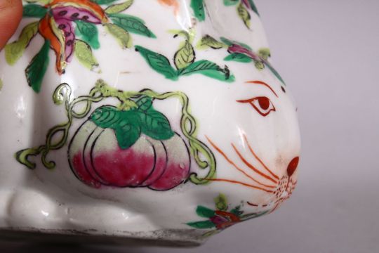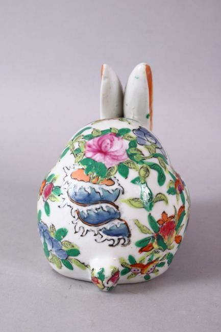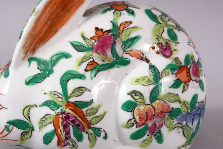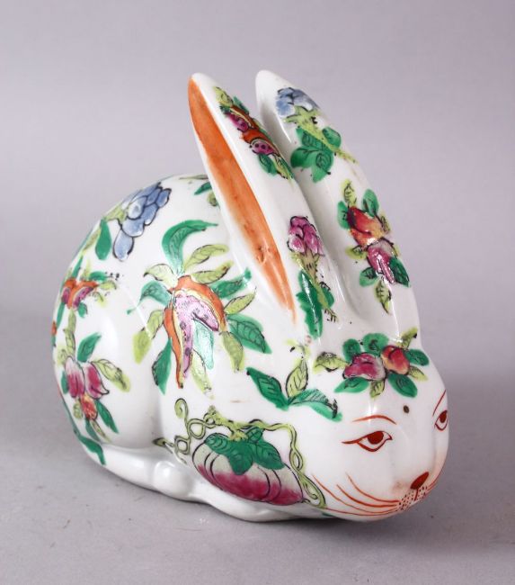 A 20TH CENTURY FAMILLE ROSE PORCELAIN HARE, painted with peach tree decoration, 12cm long.