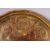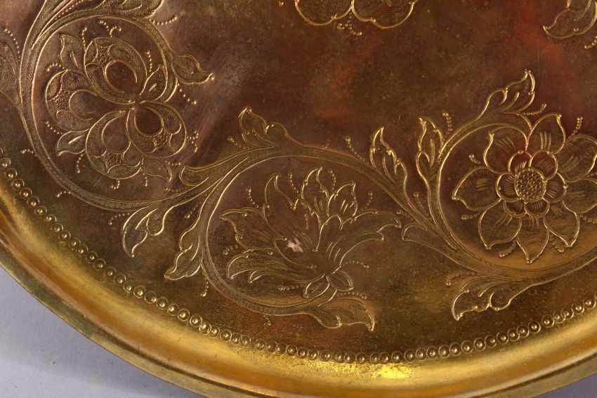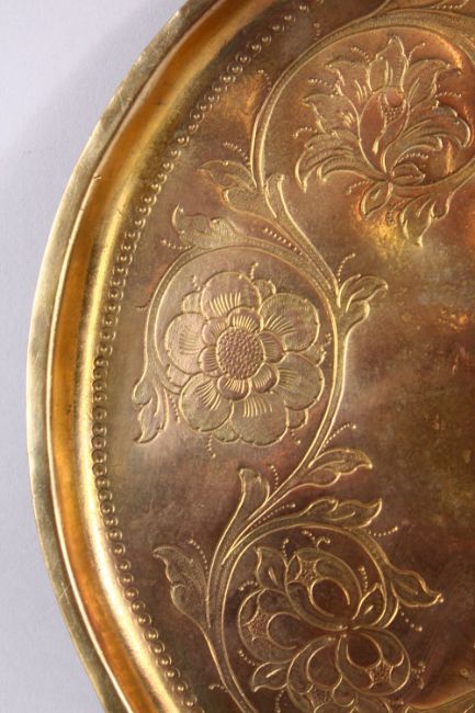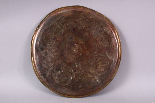 A 19TH CENTURY OTTOMAN GILDED COPPER TOMBAK TRAY, the centre engraved with a flowerhead design within a similarly decorated border, 29cm diameter.