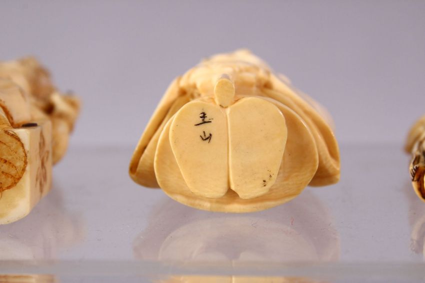 A LOT OF SIX JAPANESE MEIJI PERIOD CARVED IVORY NETSUKE, one of a seated and inlaid goddess, 6cm, two lucky gods, and three others, (6)