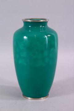 A JAPANESE TAISHO PERIOD CLOISONNE VASE, with a turquoise ground with plated mounts, with softly decorated design, 18cm