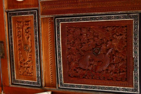 A 19TH CENTURY ANGLO INDIAN INLAID LIDDED SEWING BOX, with carved wood depicting figures and animals amongst foliage, with micro mosaic inlay with ivory banding, the interior with ivory implements and carved wooden boxes, on four carved ball feet, 45cm wide x 30cm deep x 19cm high.