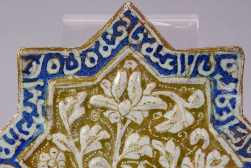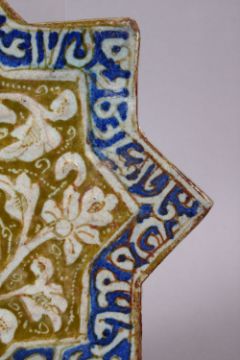 A SELJUK KASHAN STAR SHAPED POTTERY TILE, possibly 13th century, the central panel moulded with floral spray within a stylised border, 21cm diameter.