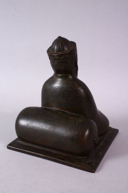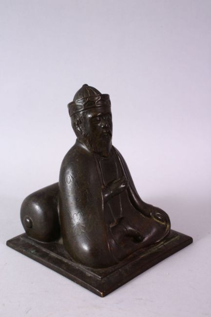 AN 18TH/19TH CENTURY BRONZE SEATED FIGURE OF A SCHOLAR, on a square base, 17cm high.