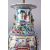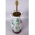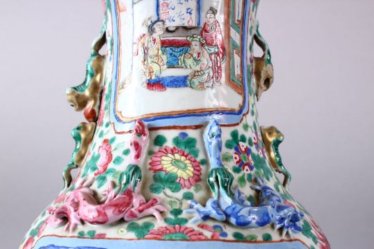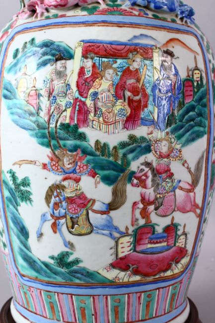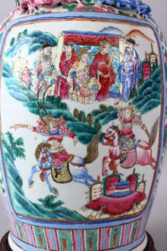 A 19TH CENTURY CHINESE CANTON FAMILLE ROSE PORCELAIN VASE, decorated with two main panels of important figures and warriors, with two smaller panels of similar, with peach, bird and flora decoration upon a white ground, moulded chilong and lion dogs, fitted for lamp with a hardwood base, overall 65cm.