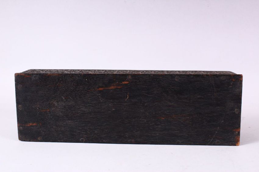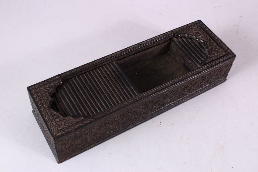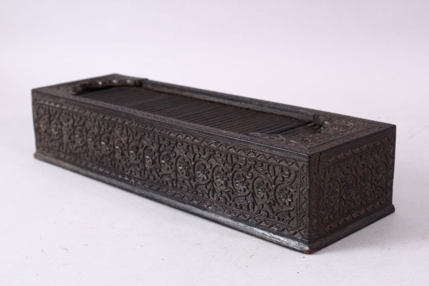 A GOOD 19TH CENTURY INDIAN CARVED EBONY RECTANGULAR PEN BOX, with tambour cover, the sides finely carved with a foliate design all around, 30cm long.