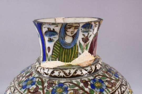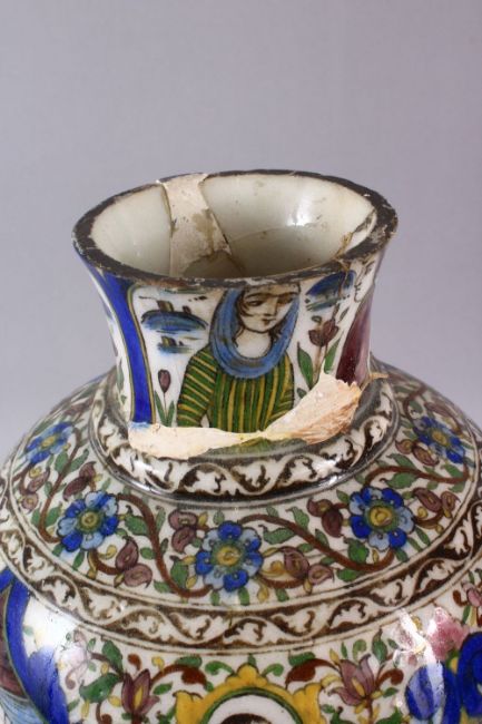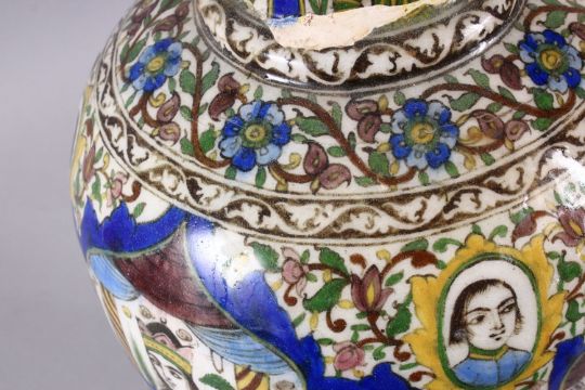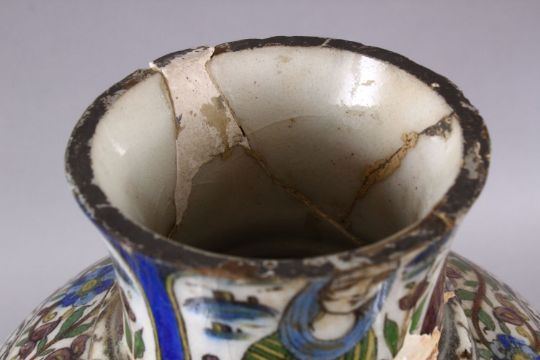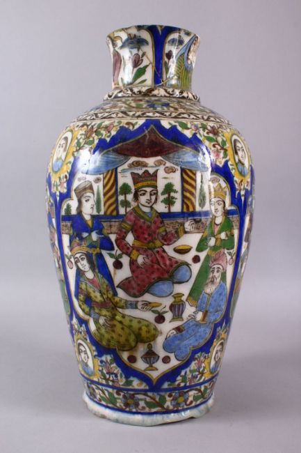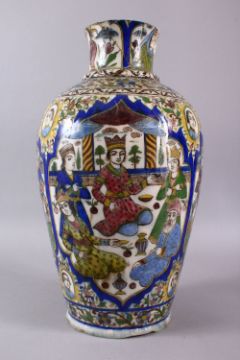 A LARGE QAJAR PAINTED POTTERY VASE, painted with panels of court scenes with figures, the neck AF, 42cm high.