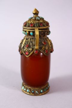 A 19TH CENTURY CHINESE GEM DECORATED AND GILT TWO HANDLED SNUFF BOTTLE, 9cm high.