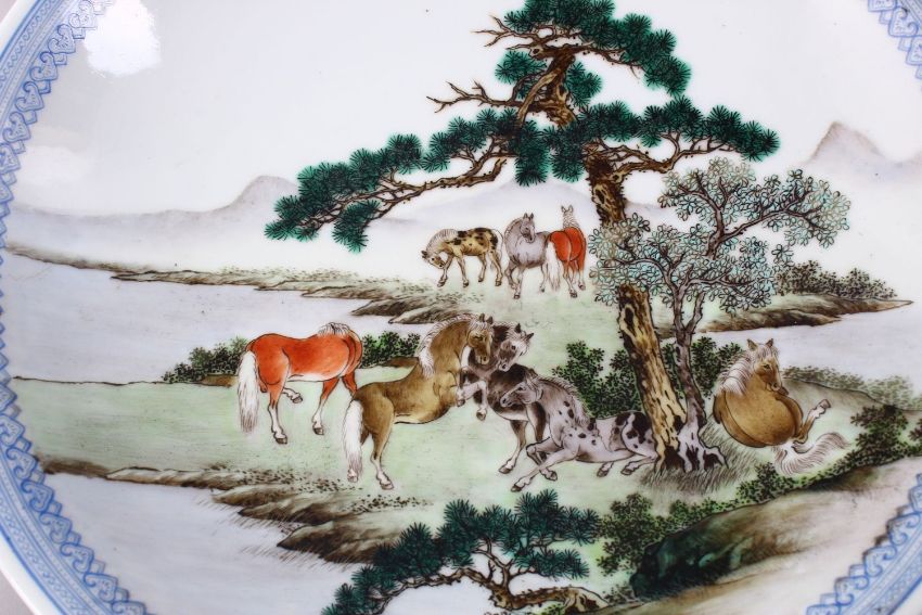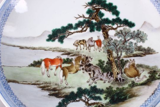 A GOOD PAIR OF CHINESE REPUBLIC FAMILLE ROSE PORCELAIN PLATES, each decorated with figures upon horseback in landscapes, with ruyi borders, the base with an iron red seal mark to base, 33cm.