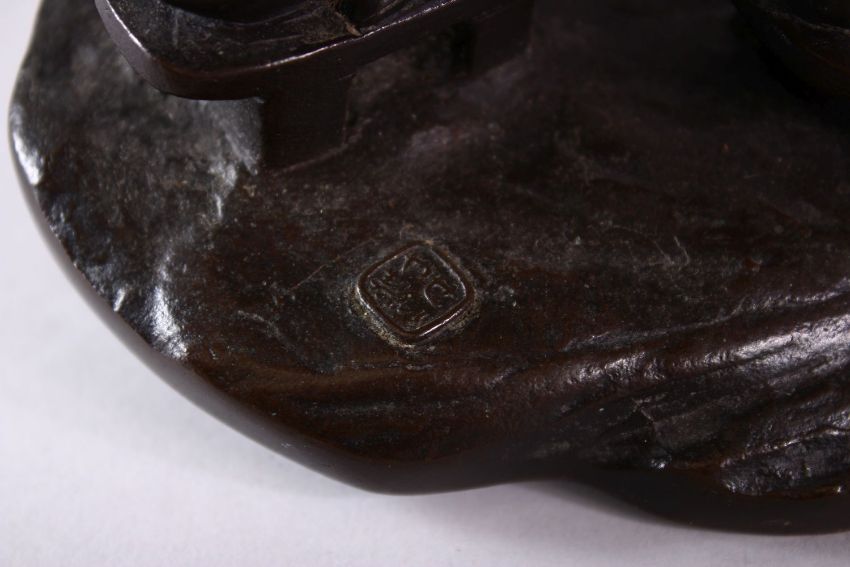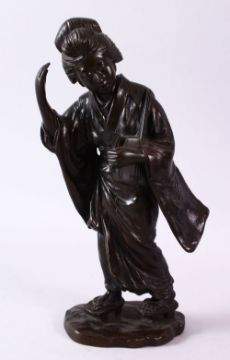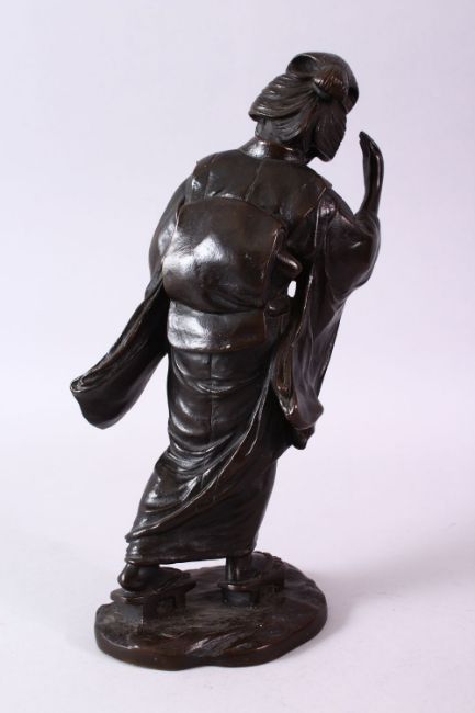 A 19TH CENTURY JAPANESE BRONZE FIGURE OF A GIRL HOLDING A MUSICAL INSTRUMENT, 32cm high.
