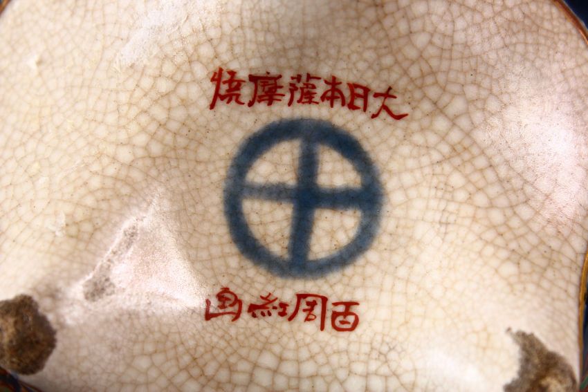 A JAPANESE MEIJI PERIOD IMPERIAL SATSUMA KORO, enamelled with precious objects and floral display, the base signed with mon (AF), 14cm diameter.