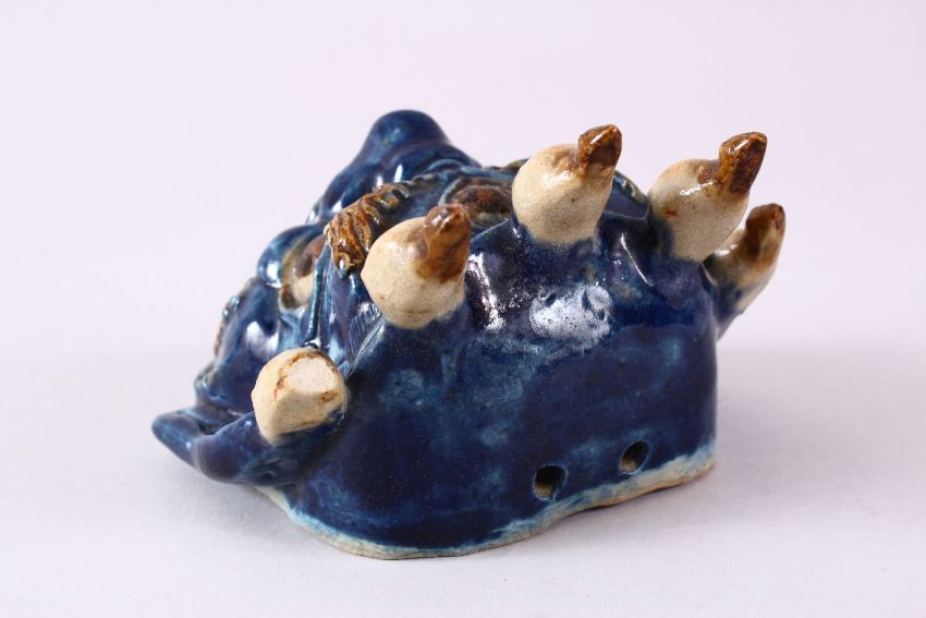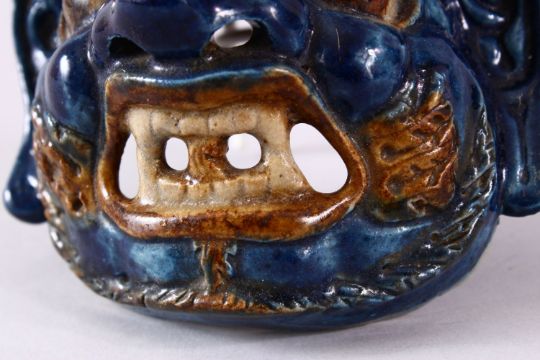 A JAPANESE MEIJI PERIOD HIRADO POTTERY MASK OF A DEMON / DEVIL, possibly hirado, the mask of the devil bearing his teeth, with blue and brown glaze, 13cm high x 11cm wide.