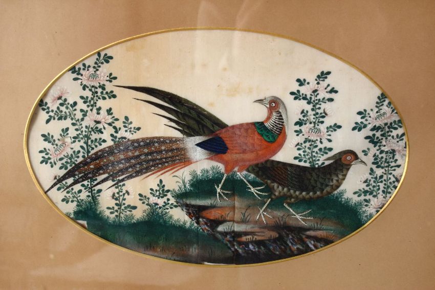 A PAIR OF 19TH CENTURY INDIAN FRAMED PAINTINGS OF PEACOCKS ON RICE PAPER, with mounted oval borders, framed and glazed, image 18cm x 28cm.