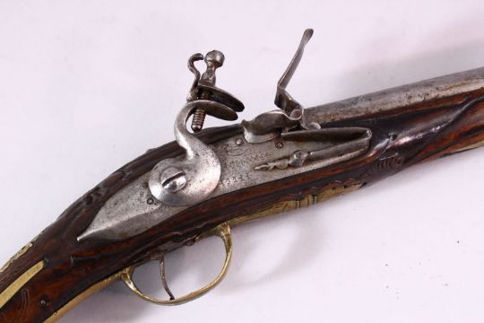AN 18TH CENTURY ANGLO INDIAN FLINTLOCK PISTOL, engraved barrel, carved stock with wire inlaid decoration and brass buttcap, 49cm long.