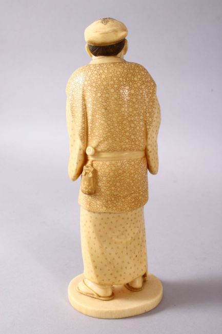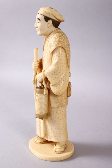 A JAPANESE MEIJI PERIOD CARVED IVORY OKIMONO - MAN, stood in traditional dress, holding his staff and a lantern with a swastika, and a set of beads, the underside with an inset red seal signature, 20cm high