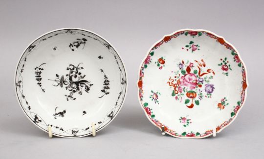 TWO 18TH CENTURY CHINESE PORCELAIN SAUCERS, One decorated in famille rose, the other grisaille, 12.5cm.